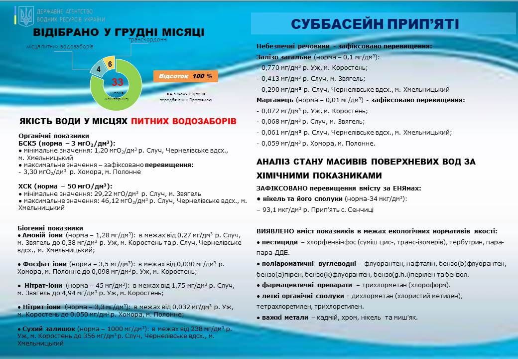 Інформація про результати досліджень та якісний стан масивів поверхневих вод у межах суббасейну Прип’яті протягом грудня наведено у інфографіці, а більш детальна інформація вміщена за посиланням https://buvrzt.gov.ua/yakist.html