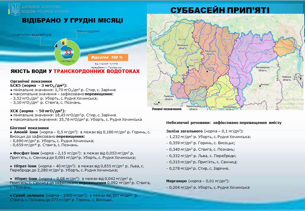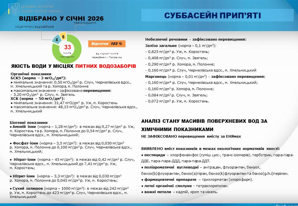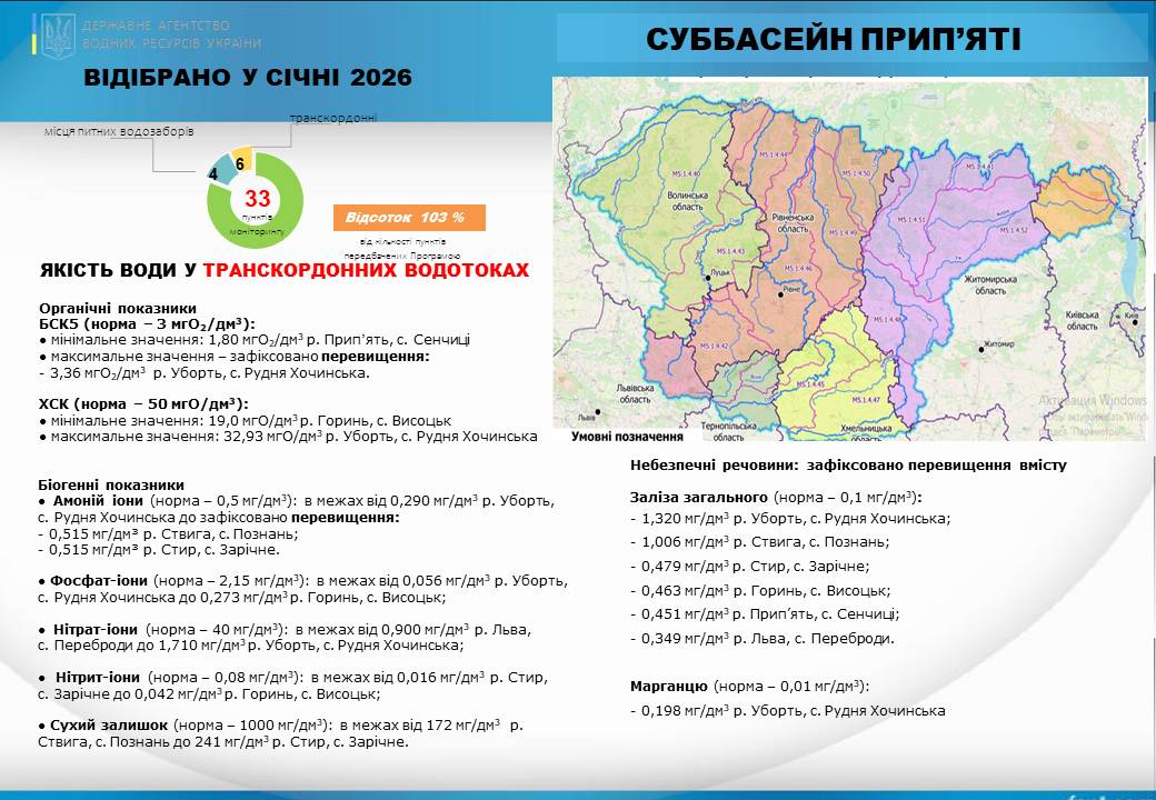 Порівняно з груднем у питних водозаборах суббасейну фіксується підвищення вмісту марганцю (окрім річки Уж), а в річках Уж та Хомора заліза загального. В транскордонних водотоках фіксується зниження хімічного та біологічного споживання кисню (окрім річки Стир) та підвищення вмісту заліза загального. Вміст амоній-іонів підвищився в річках Припʼять, Горинь, Льва, Стир та Случ.